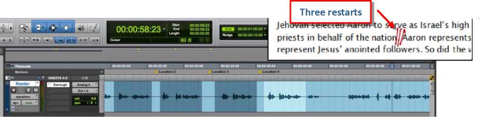 49. The recording technician will be given a copy of the formatted script. When a reader makes a mistake, he will be directed by the coach to restart at the beginning of the sentence or paragraph, at a pause for punctuation, or before a quote. For each restart, the recording technician should mark the location in the Pro Tools session. One way to do this is to create a memory location in Pro Tools, as shown below. These memory locations will make it easier to find the location of errors during rough editing. The technician may also use his copy of the script to mark these locations and take other editing notes.
