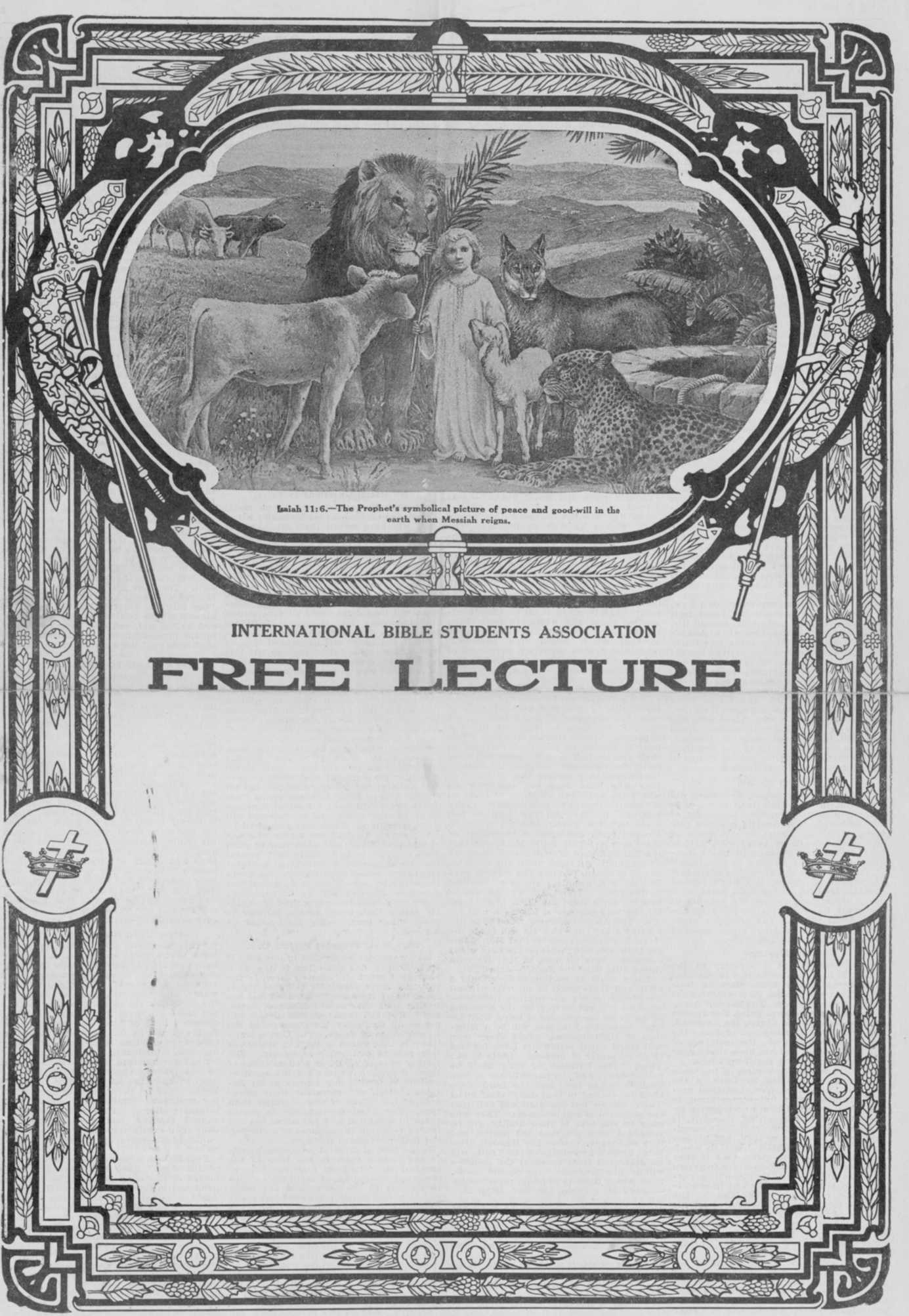 Four Million copies of “The Divine Plan of the Ages” have been placed in the homes of Christian people. The book is published in fourteen different languages. Aside from the Bible itself, the demand for this book has been the greatest of any ever published. Students of the Bible have found that “The Divine Plan of the Ages” is indispensable to their studies. It removes the stumbling stones. The book of 384 pages, neatly bound in imported cloth and containing an interesting Chart of the Ages, is published and distributed by the Bible and Tract Society, No. 15 Hicks St., Brooklyn, N. Y., for the nominal sum of 35 cents per volume, any language. This book has made Pastor Russell famous, and has made thousands of Bible students strong in the faith of God 3 Word and a mighty power in the battle for the Truth.