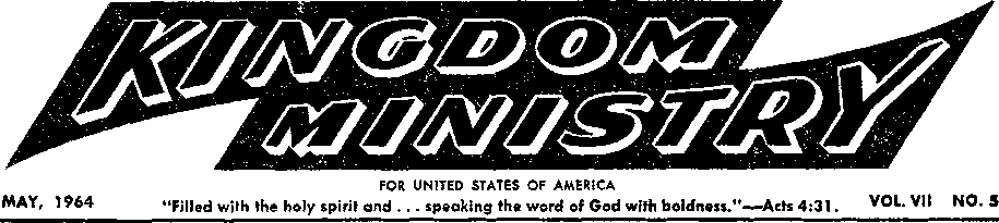 10 min: Talk on monthly theme. (See ‘Watchtower” of July 1, 1963, pp. 396409, also June 1, 1964.)