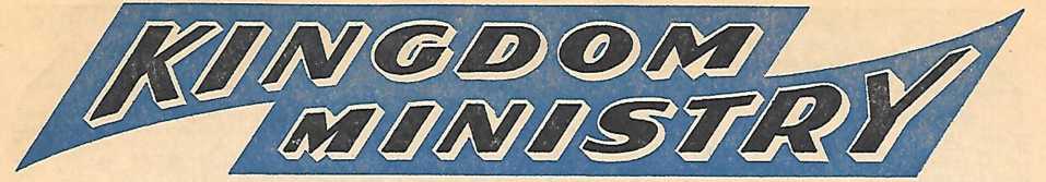 18 min: Be Workers like Jehovah and Jesus. Talk, with comments from audience on scriptures and points selected by speaker from the material on "Work,” pages 1670 and 1671 of Aid. 17 min: Results of Informal Witnessing. Experiences from publishers showing what good results come from being alert to witness at every appropriate opportunity. Should be selected in advance. Perhaps some have had good experiences in witnessing en route to and from assembly. If local experiences are not available, some can be selected from the Yearbook. Concluding comments. Song 39.