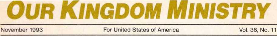 ® 1993 Watch Tower Bible and Tract Society ot Pennsylvania All rights reserved. Our Kingdom Ministry (USPS 295-360) is published monthly by Watchtower Bible and Tract Society ot New York. Inc., and International Bible Students Association 25 Columbia Heights. Brooklyn. NY 11201 Second-class postage paid at Brooklyn. N.Y and at additional mailing offices postmaster: Send address changes to Watchtower. 25 Columbia Heights. Brooklyn, NY 11201. Printed in U S A.