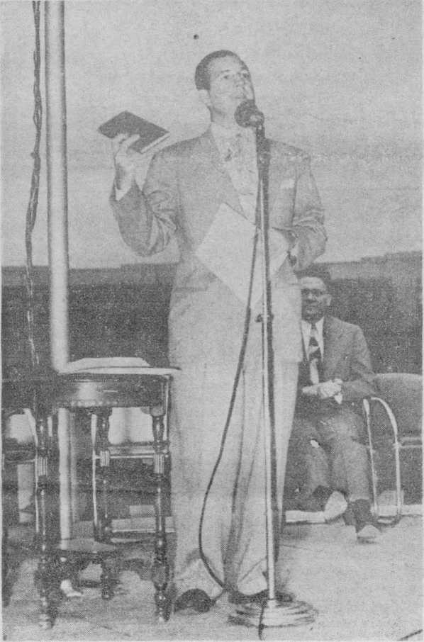 The release climaxed a very powerful discussion of the subject, “Let God Prove to Be True”, based on Romans 3:4. (A synopsis of the talk will be found elsewhere in this issue.) The calm logic of the presentation, which added proof to proof showing God to be true and the Bible his Word, and the stand of the Roman Catholic church as its interpreter to be wrong, gripped the audience tensely. Applause was involuntary when the speaker forcefully clinched each salient point.