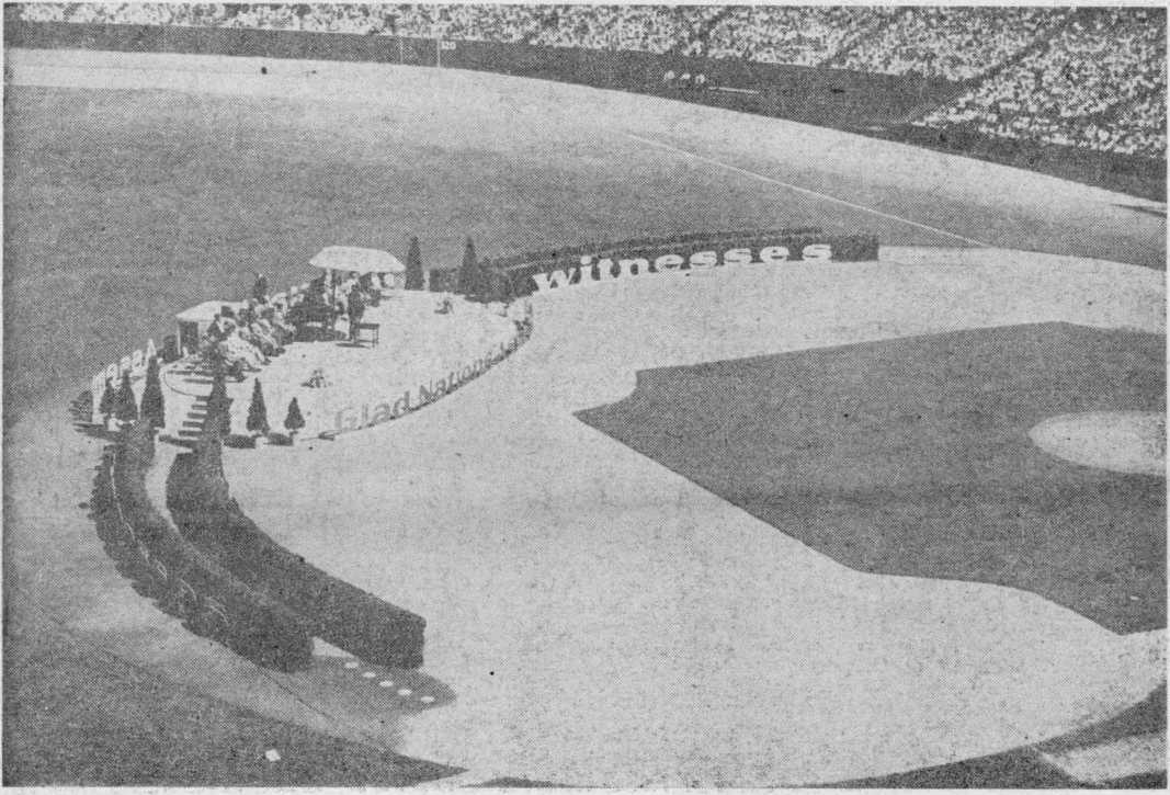 trative buildings of the camp and during the sessions quite large numbers may be seen gathered around, some sitting on the steps of nearby trailers, others reclining on the ground in the sunshine. Telephone lines connect the camp with the Stadium, and excellent amplifying equipment insures proper reception of all programs.