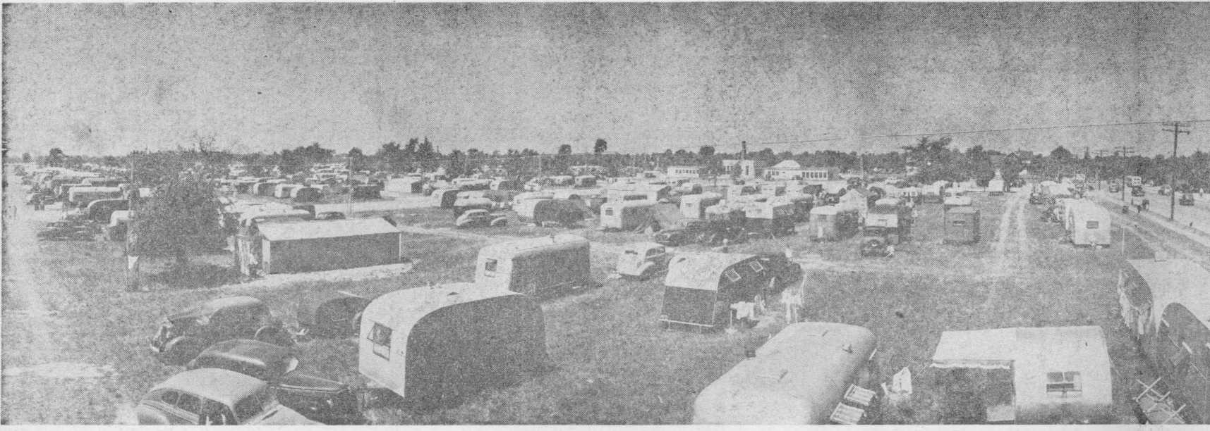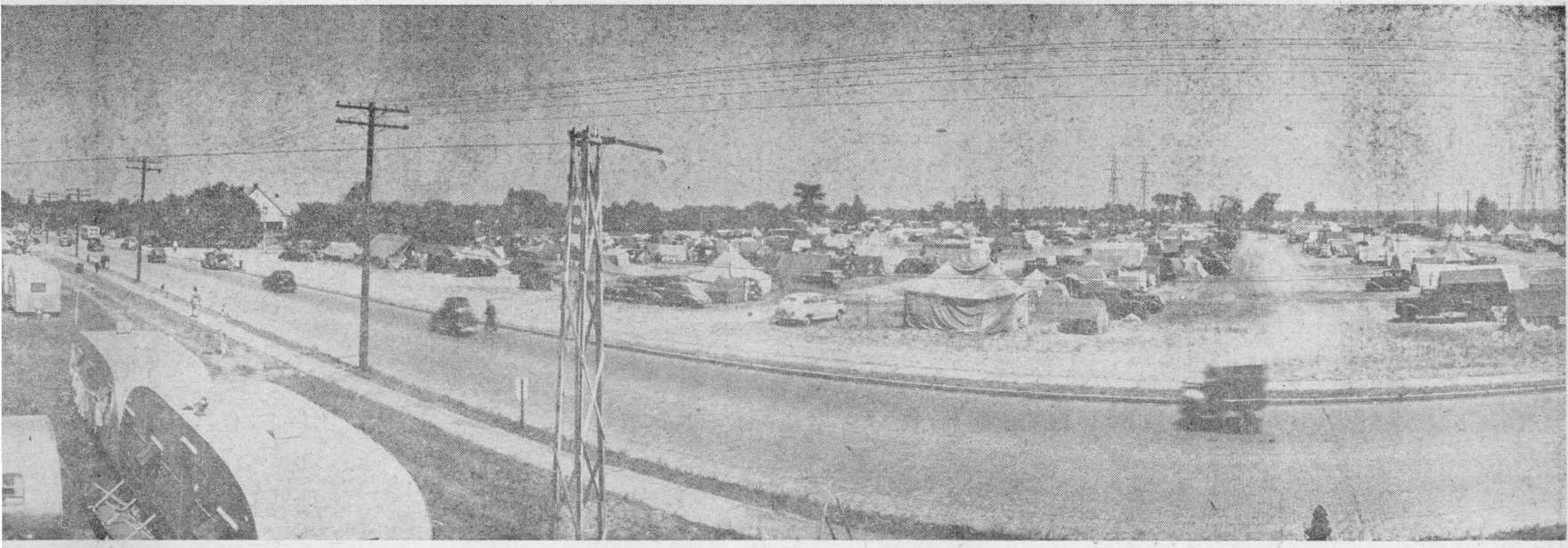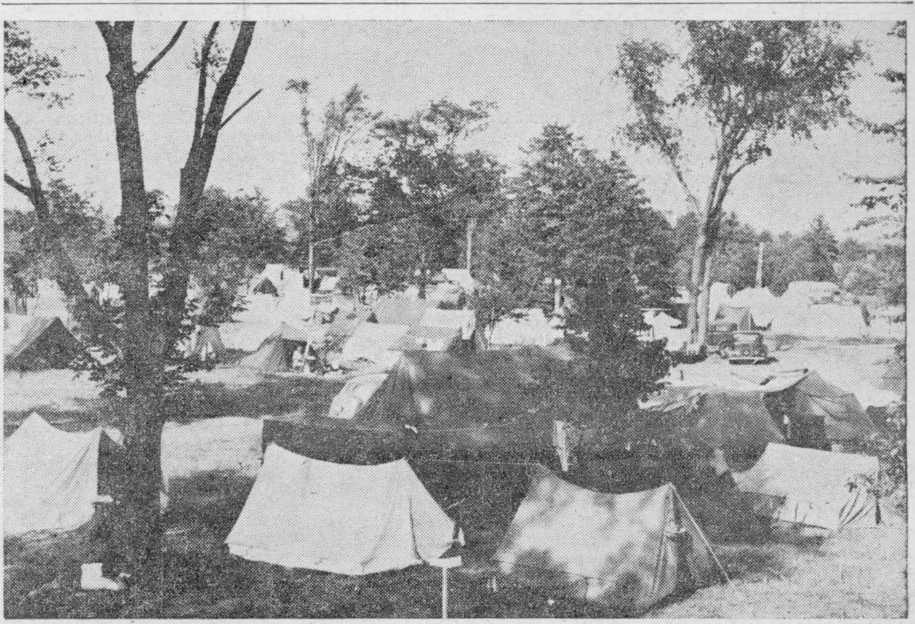 Many hours could have been spent walking through the camp and talking to its different residents, listening to their- travel stories and experiences and noting the different types of tent, trailer or converted truck that went to make up their temporary homes. The largest single unit identified was a large truck which had carried its load of 54 brethren from New Mexico in six days. Origi-(Continued on page 8, column 2)