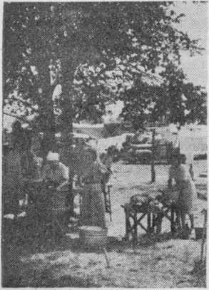 No large-scale feeding arrangements were made by the camp organization, as the Society has made bountiful provision for the feeding of all convention delegates in the great underground cafeteria building in the convention grounds. Camp residents swarmed out of their temporary homes early in the morning to make the nine-mile journey to the cafeteria, where breakfasts are served from an early hour. But many must remain behind at the camp for all or part of the day for different reasons, and so refreshment stands, four in number, were erected. The demand is great, and large numbers of camp residents throng the stands from 6 a. m. to 12 midnight, thus suggesting that the pangs of early morning hunger must first be satisfied before the city-bound journey is undertaken. Cereals, milk, bread, sandwiches, cupcakes, rolls, doughnuts, peaches, plums, oranges, fudge, punch and other varieties of food may be obtained at reasonable rates. Refrigerating plants have been installed to insure the proper preservation of supplies.