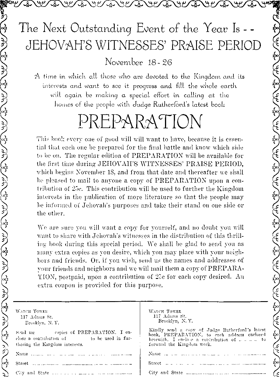 We try to describe Judge Rutherford’s latest book Preparation, and what follows are ideas snatched here and there from what is at the moment the most important book in the world. The book is so compact, so condensed, that it is difficult of description. It is an exposition of the prophecy of Zechariah. If we had once thought Revelation and Ezekiel the most difficult books of the Bible to understand, they now yield the palm to Zechariah; yet in Preparation the whole book yields its treasures. And what treasures!